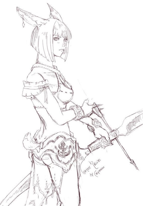 Fhjrn Rava was born in the Black Shroud to a Keeper mother and a wayfaring Rava sire. The coupling resulted in a strangely shaped girl: ears longer than a miqo'te's, but not so long as a Viera's; a miscoloured nose; eyes too large for her face; a bobbed tail that looked like a hare's. Her misshapen features set her apart from the rest of her village, but worse than their scathing comments were the voices she could hear from the Woods themselves.Nearly driven mad by the voices, Fhjrn left her Keeper village to seek out the advice of a Gridanian Hearer. But they, too, judged her for her looks and her heritage, having little love for miqo'te already.She ran then to Thanalan, where the voices of the Woods would hopefully be quieter. And it was there she ran into Lord Emery Rossler. He commented not on her misshapen features nor her frenzied fervour to escape the voices.Instead he offered her a place among his little family in the Resistance, having a keen eye for talent and tenacity when he saw it. Thanks to him, Fhjrn was able to start her life anew with confidence and pride.And she would do anything to repay that debt.
